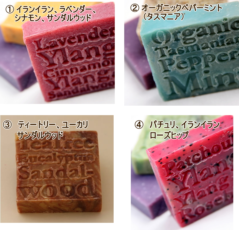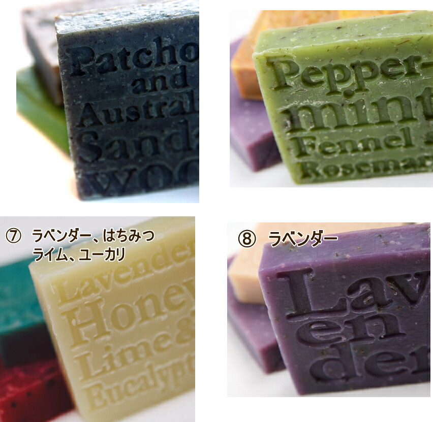 [アウトレット20%OFF!] 通常価格1,800円 香りが少し弱くなっています。 石鹸としての品質には問題ございません。 ※ 割引き対象 1) イランイラン、ラベンダー、他 2) オーガニックペパーミント 7) ラベンダー、はちみつ、他 8) ラベンダー 11) パインミントライムユーカリ