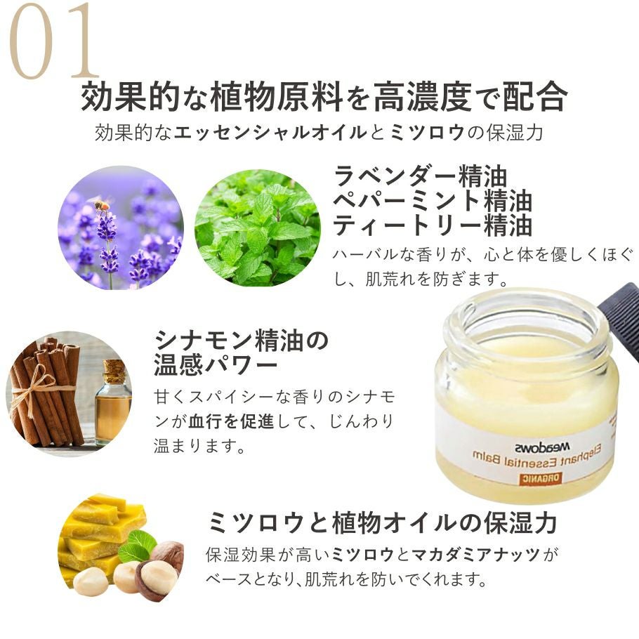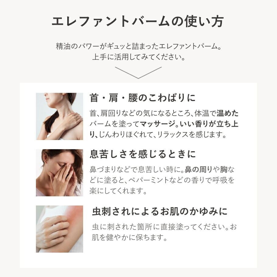 他の画像を見る スッキリ美しい香りで、頭、肩、気分もスッキリ!人気のアロマ便利軟膏 野生の象の保護にご協力を エレファントバーム (アロマ軟膏) メドウズ社 販売価格 ¥ 2,200 税込 カートに入れる お気に入りに登録する
