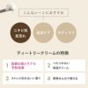 ティートリークリームは、そんなお肌を柔らかく健やかに保つ頼りになるクリーム。毛穴を塞ぐこともないので、大人ニキビでも、思春期ニキビでもお肌をなめらかに保つ保湿クリームとしてお使いください。