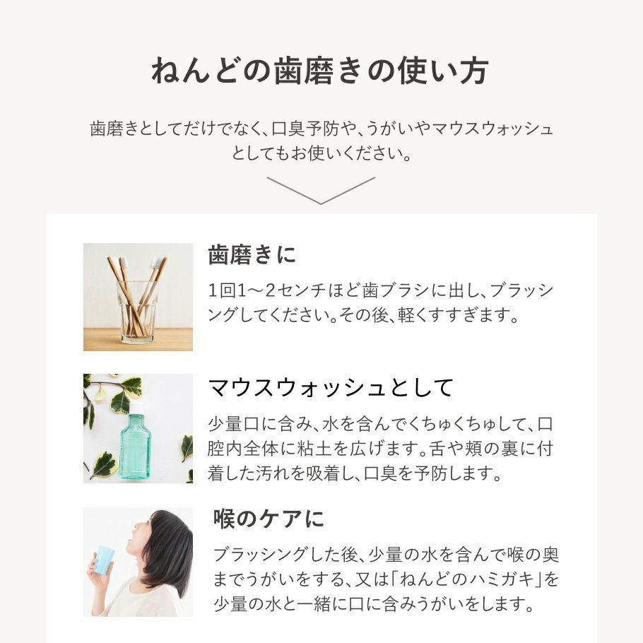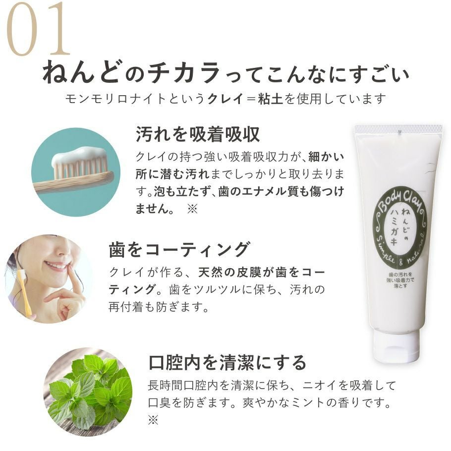 他の画像を見る 天然原料100%の体に優しいハミガキ。しっかり汚れを落として口臭もサッパリと ねんどのハミガキ(歯磨き) ボディクレイ研究所 販売価格 ¥ 1,375 税込 カートに入れる お気に入りに登録する